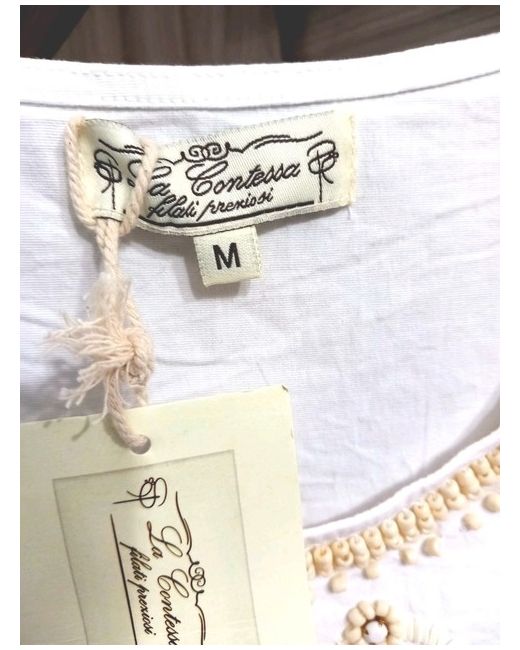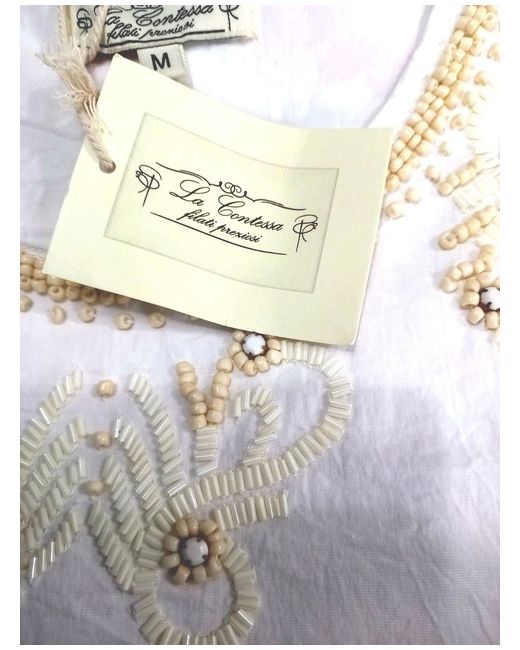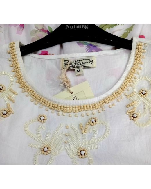 Pretty linen look white top ,with hand sew beads at the round neck. Made In India . Material is easy care Viscose with slight stretch .linen look Slightly longer at the back . Cap sleeves .Great for Summer . Size 14 Measures 19 inch pit to pit. 24 inches shoulder to hem Immaculate, new with tags