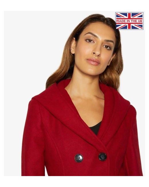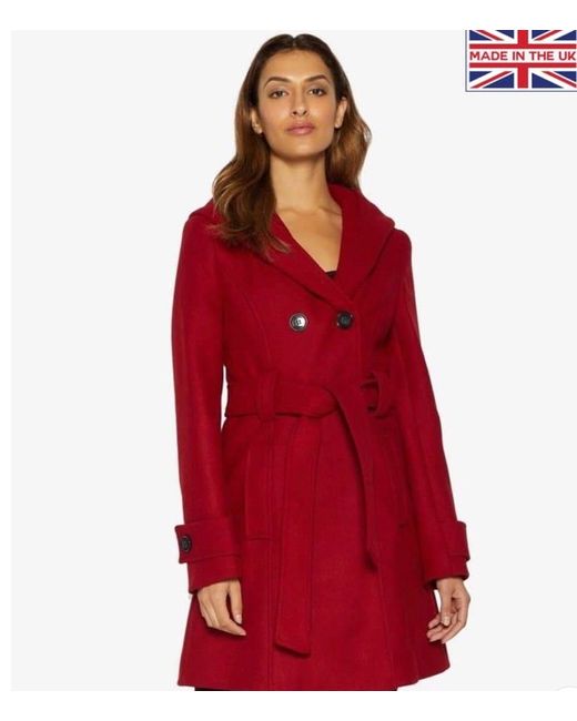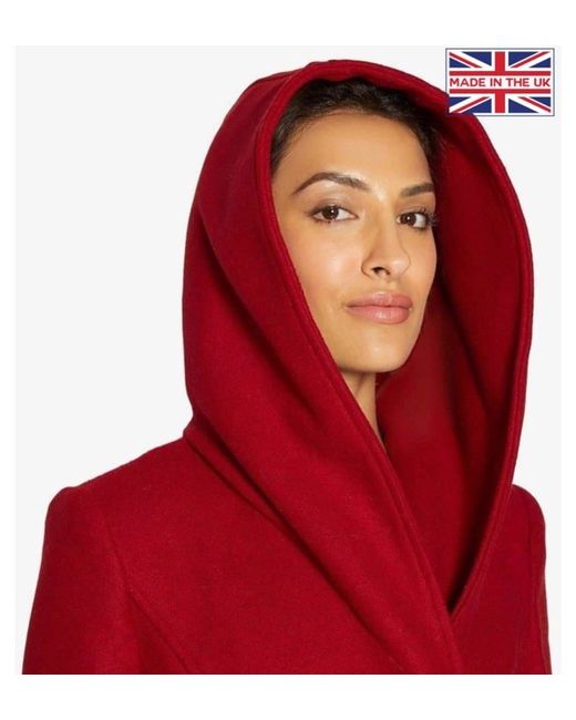 A belted hooded mid length winter coat. Features are a hood that falls into a shawl collar and two pockets. This coat is Made in England. Hooded Winter Coat With 2 Pockets. Material: 65% Polyester 33% Viscose 2% Elastane.