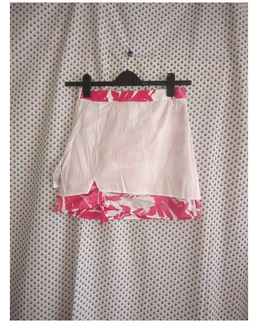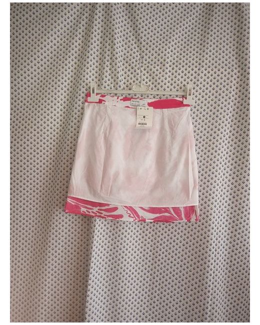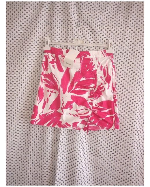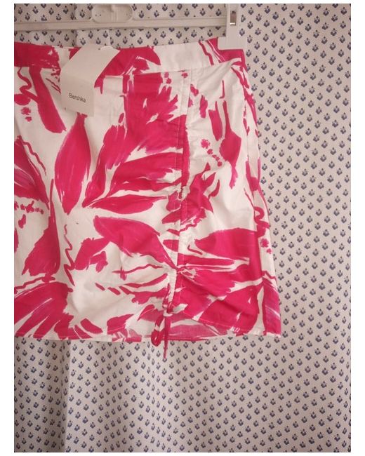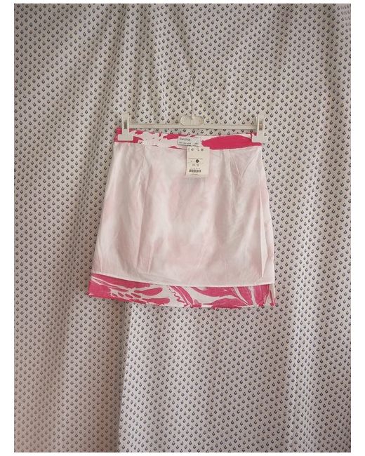 Modern and stylish Bershka pink and white patterned lined ruched side mini skirt. The left-hand side at the front has two channels with threads to ruch up to make the skirt as shorter on the one side.