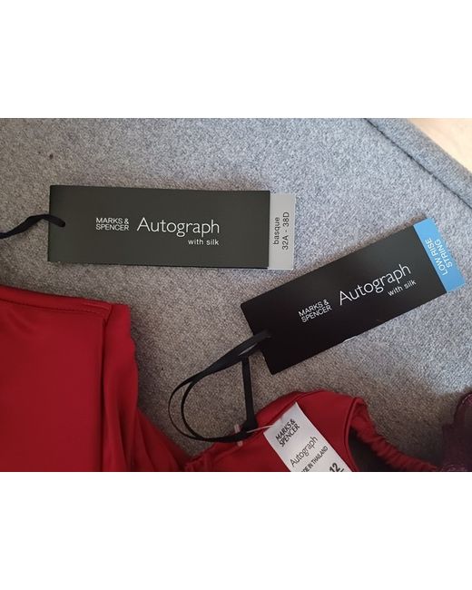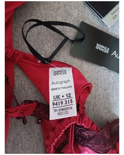 Marks And Spencer Autograph Real Silk Blend Thong Sz Uk 12 & Matching Basque Sz 34 D. All New With Tags. Please Note The Shade Of Red Is Slughtly Darker Than Photographs Are Showing. Not As Bright. Please Refer To All Photographs Before Bidding. The Photographs Are Also Part Of The Description. If At All Unsure Please Do Not Bid. Postage Recorded Delivery. Payment To Be Received Within 24 Hours Of Close Of Auction. No Local Pick Up.