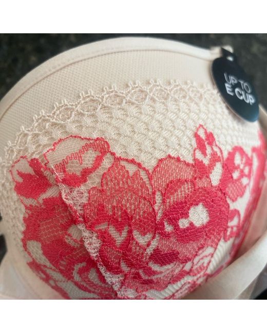 Brand new but tags are off except for the one that says the bras go up to E cup Obviously not worn with that tag still on it ! Been in a drawer for ages but too big Pretty beige bra with pink lace overlay padded bra with under wire