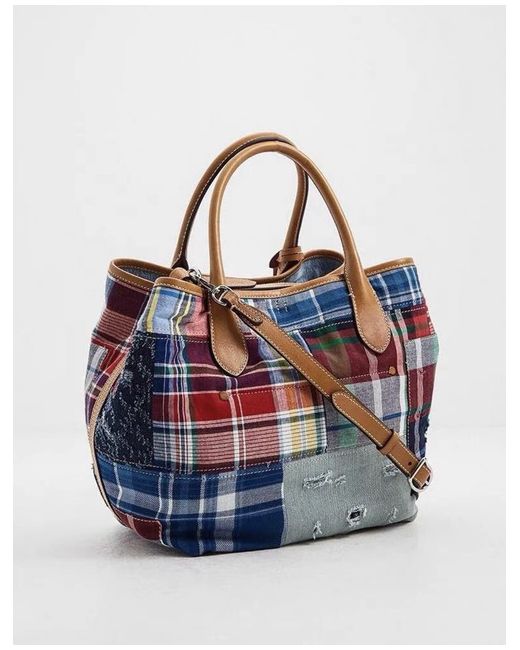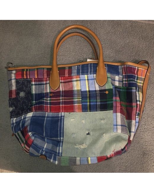 POLO RALPH LAUREN Patchwork Tote Hand Shoulder Shopping Bag Check Tartan Denim. Leather handle with long strap