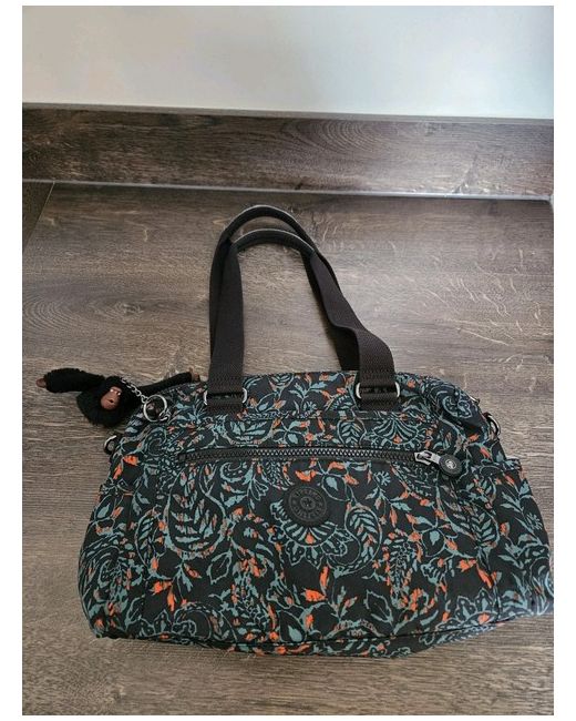 Lovely Kipling Bag with shoulder strap and matching purse Multicoloured exterior with green and orange on a black background Black monkey called Devina Interior - pale green Interior - 1 zip pocket and 2 open pockets Exterior - 1 zip pocket and 1 velcro fastened pocket and 1 open pocket at each end of the bag Measures W 35 cm D 9 cm H 23 cm not including straps Purse has note compartment, 3 slots for cards, 2 mesh compartments and a zipped money compartment
