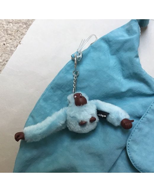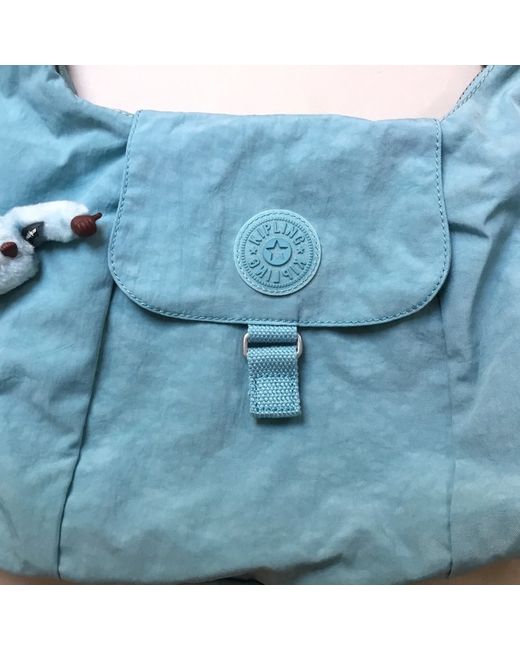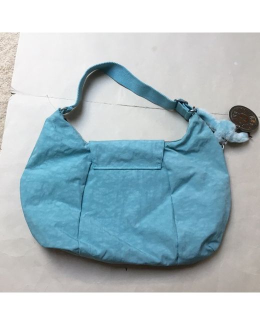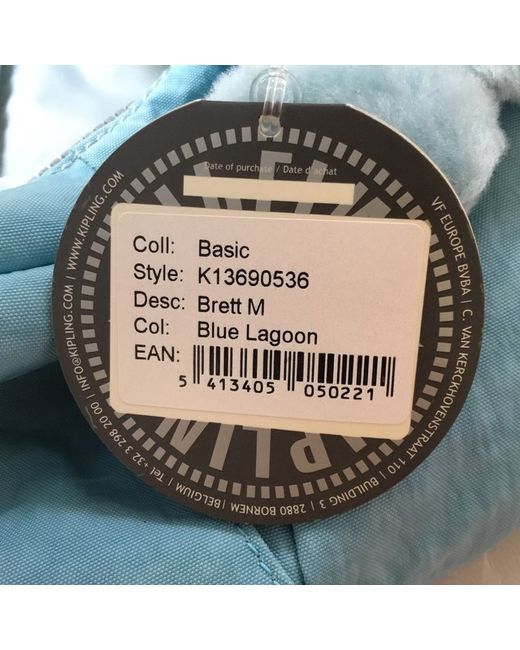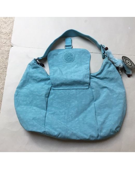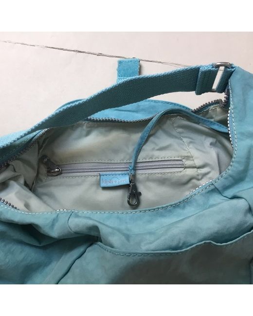 It is described as a blue lagoon colour, and has an adjustable strap. The front has a velcro flap with the Kipling logo on it, Velcro pocket to the front that the flap covers. inside there is a zipped pocket on the back with the Kipling label sewn in below, while towards the front there is 1 larger pockets and 2 smaller for pens, and also has a key chain.