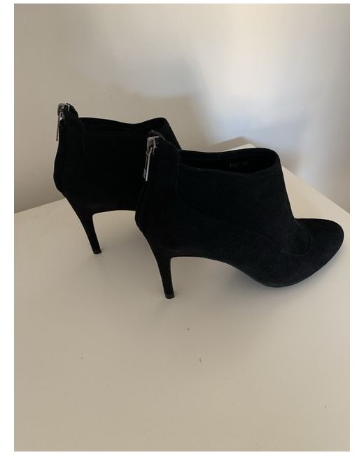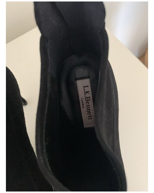 These high-heeled ankle boots in size 6 are a stylish addition to any woman's shoe collection. Crafted by L.K. Bennett, they feature a pointed toe and a suede upper with a leather lining for a touch of luxury. The black colour and bootie style make them versatile for both casual and more formal occasions. With a synthetic outsole and a heel height of 7.6-10 cm, these boots are sure to provide both comfort and a fashionable edge to any outfit.
