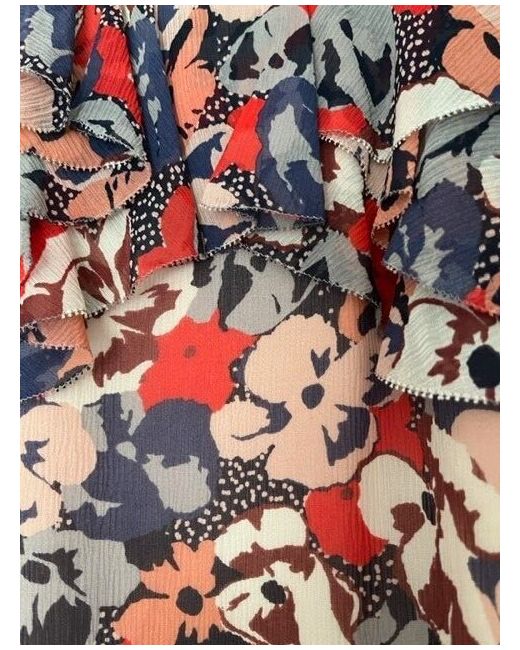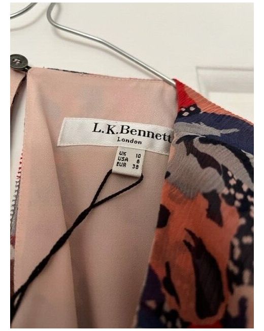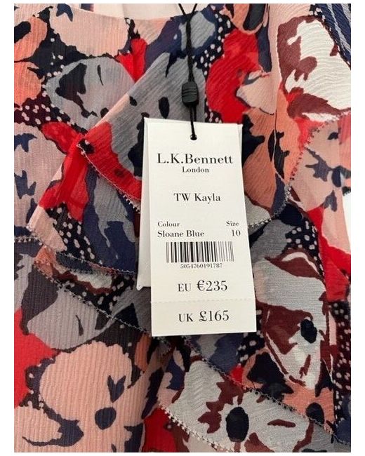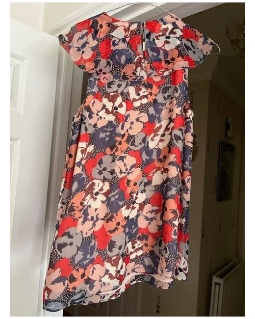 Pale pink lining 100% polyester. Pretty pattern with blue, pink and red flowers and a frill round the neck. Single button fastening at back. Approx hip length so will hang nicely over trousers or a skirt.