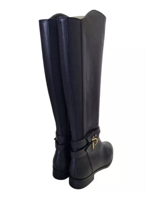 Made from supple calf leather, the Kora riding boots are sophisticated and sleek, with a beautiful belted detail. This black pair has a low block heel, hits below the knee and has an elasticated panel ensuring the ideal fit on all calves.