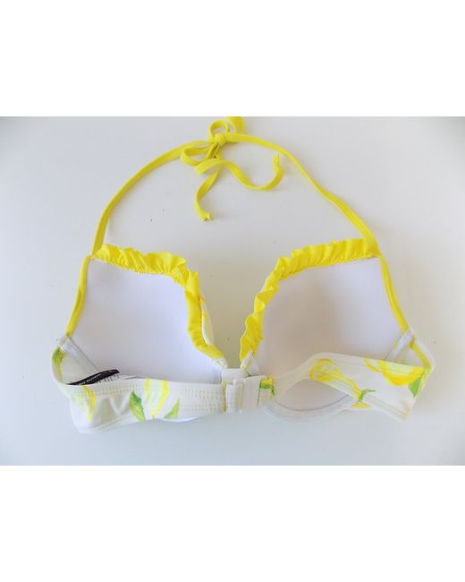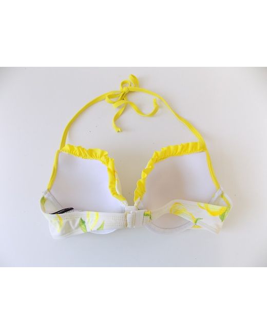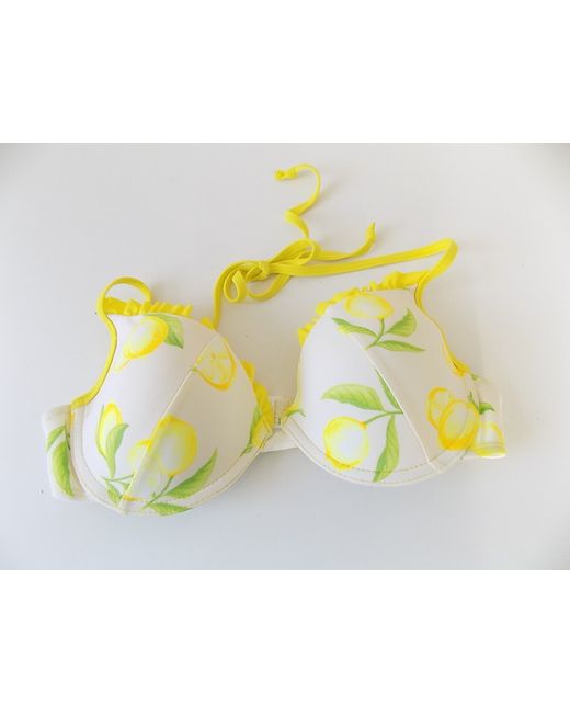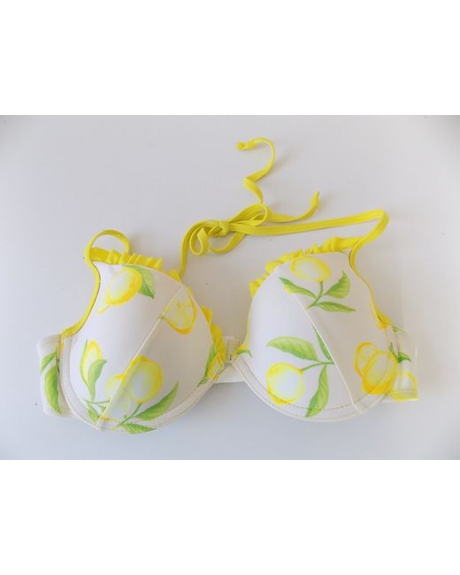 This is a very pretty bra by Vero moda. With a cream background it has a lovey lemon pattern. It has tied halter neck and clasp fastening at the back. 34D = EU 75D. 34C = EU 75C. 34B = EU 75B.