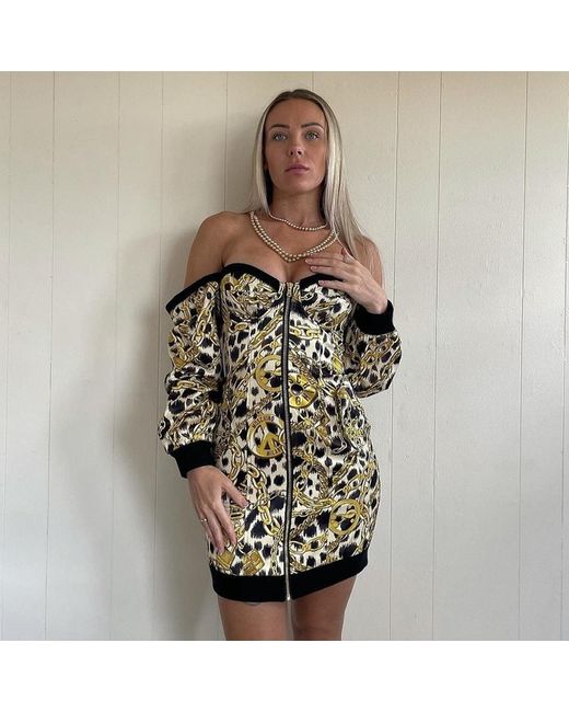H&Moschino Corset Dress. Iconic Moschino Peace Sign. Beautifully tailored dress in an incredibly soft, smooth, OPULENT fabric. Gold Plated front Zip. Oversized Sleeve.
