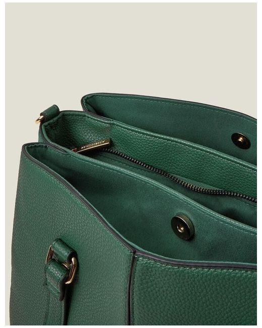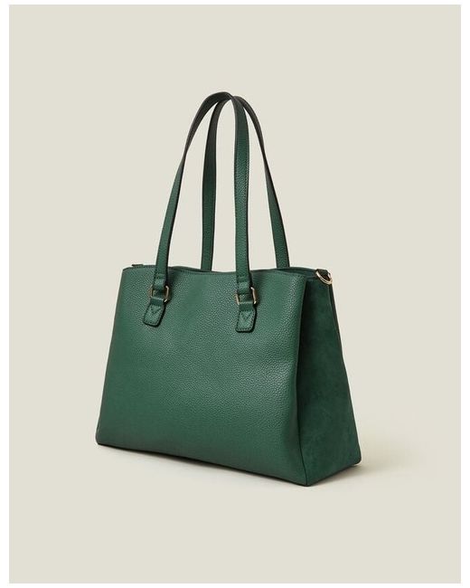 This tote bag is crafted from faux leather in a dark forest green shade. Featuring three main compartments with zip and magnetic button closures, two shoulder straps and a detachable webbing strap. Outer: Outer: Polyester 20% , Polyurethane (PU) 80% Lining: Lining: Polyester Recycled 100% L 27 CM x W 34 cm Weight: 560 New with tags £38