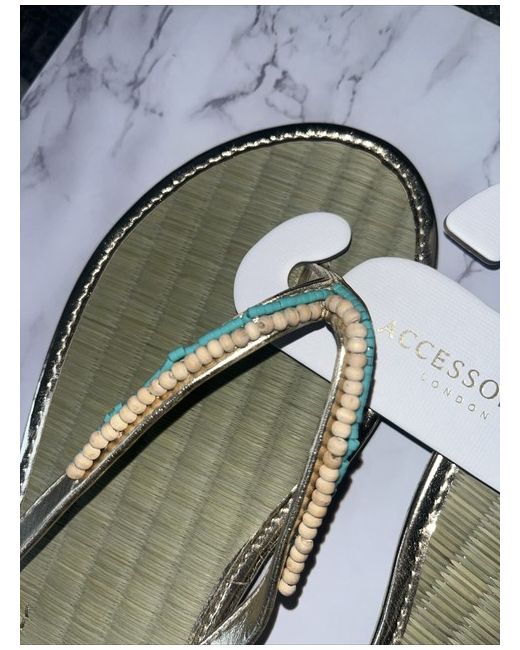 Accessorise Monsoon Ladies flip flop sandals - Size M Medium UK 5 6 EU 38 39 - Gold with turquoise blue and beige beaded embroidered detail - Seagrass, making a very comfy sole for your feet - Perfect summer accessory Brand New Enjoy :-) Please check other items