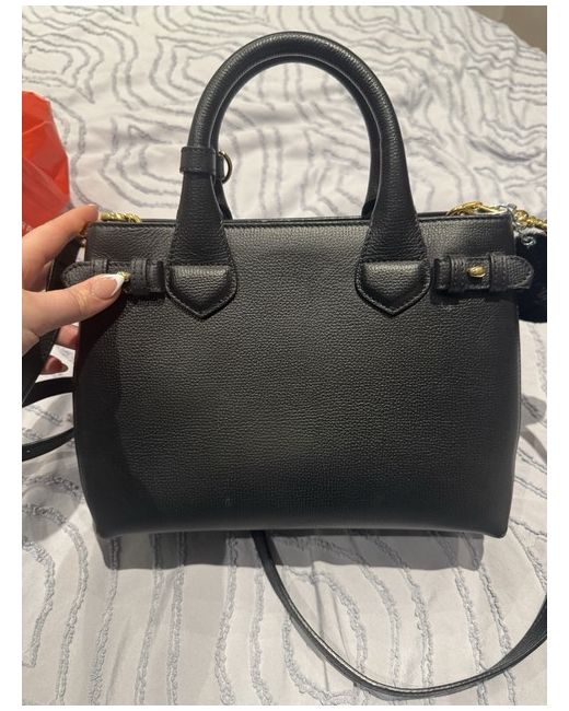 This Authentic Burberry Banner small bag in black leather features a top handle design with black hardware. Perfect for women, this stylish accessory showcases the iconic Burberry brand and is ideal for carrying essentials in style.