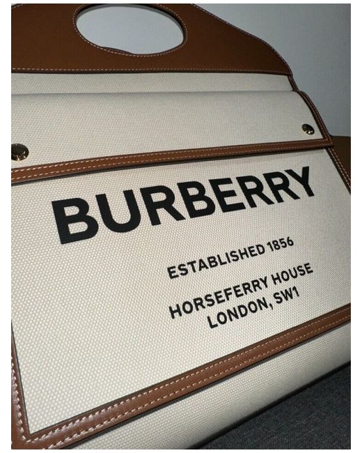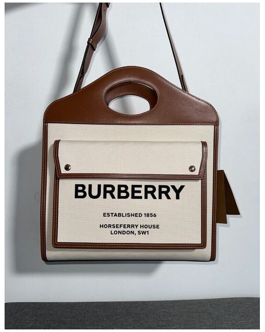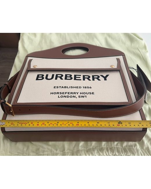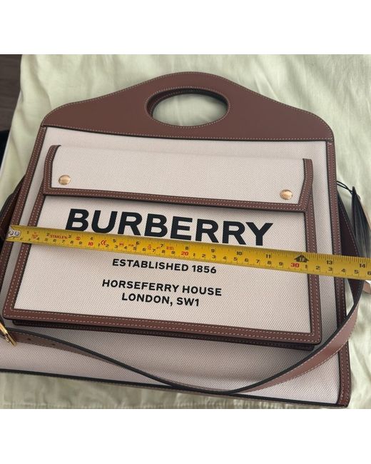 The Burberry Canvas Pocket Bag is a large square-shaped handbag with a crossbody strap for easy carrying. Made of beige canvas with brown leather accents, it features a beige canvas lining and multiple pockets for convenient storage. With a height of 42cm, width of 37cm, and depth of 10cm, this designer bag exudes a stylish and sophisticated look ideal for women who appreciate quality and luxury accessories.