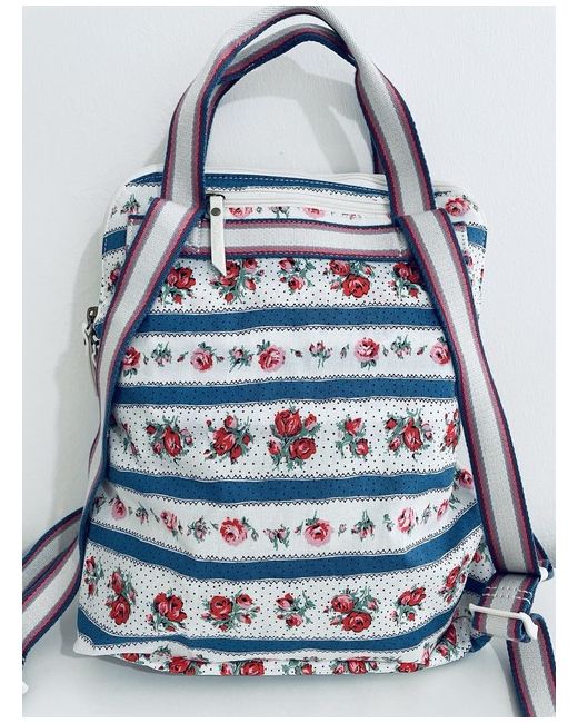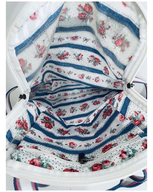 The bag features a beautiful floral pattern on a white PVC exterior, with multicoloured hardware accents. It has a zip-around closure and is water-resistant, making it perfect for all types of weather.