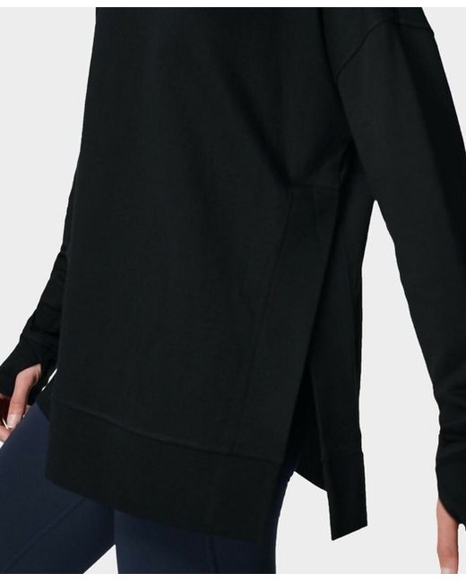 Breathable blend of organic cotton and stretchy modal. Colour: Black Fabric: Composition: 49% Modal, 51% Organic Cotton. Cleaner seamlines and a new, exaggerated split at one side. Dropped shoulders, cosy thumbholes and V-stitch detailing at the neck.