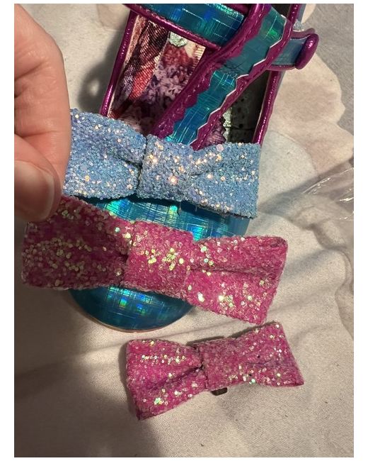 Brand new Irregular Choice “River Rapid Court Heels Shiny blue and pink Size 4 Unfortunately I didn’t have the box Changeable glitter bows I have LOADS of Irregular Choice Shoes for sale in size 5, 6 and 7… check them out 🥰
