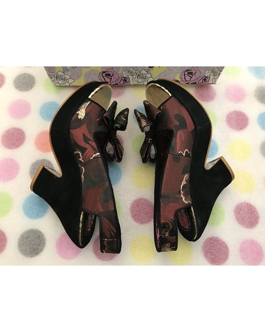 IRREGULAR CHOICE RUBY TULIP TOWN BOW BLACK GOLD OPEN TOE PLATFORM HEELS SHOES. Made of leather and coloured jacquard material black gold burgundy. Fun sandals from Irregular choice. The quality pictures combined with the zoom feature allow you to inspect the finer detail and quality of the heels.