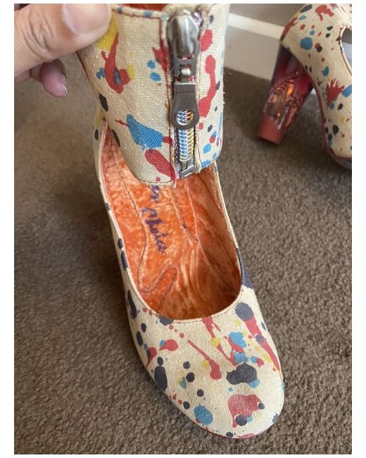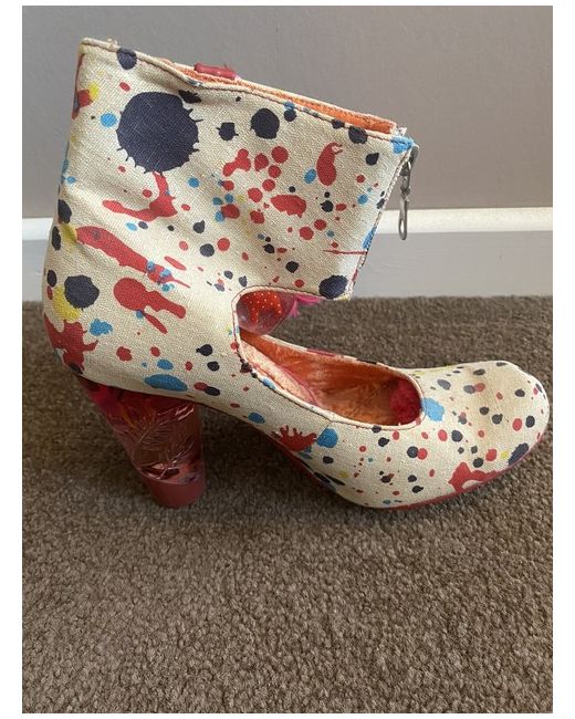 PLEASE READ: Never been worn Beautiful Irregular Choice Making Moves Splatter Cuff boots/shoes Red Heeled Shoes Quirky Design With baby Pom Pom Keyring Size 39/6 Detachable Keyring features food, animals, baby pompom (one has come off) but it’s still there so can be sewn on Comes with original box (has a small tear please see photos) Lovely design, no longer available