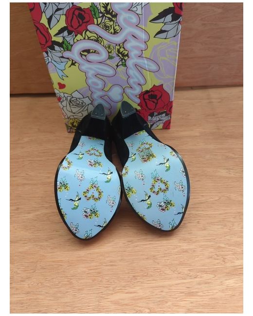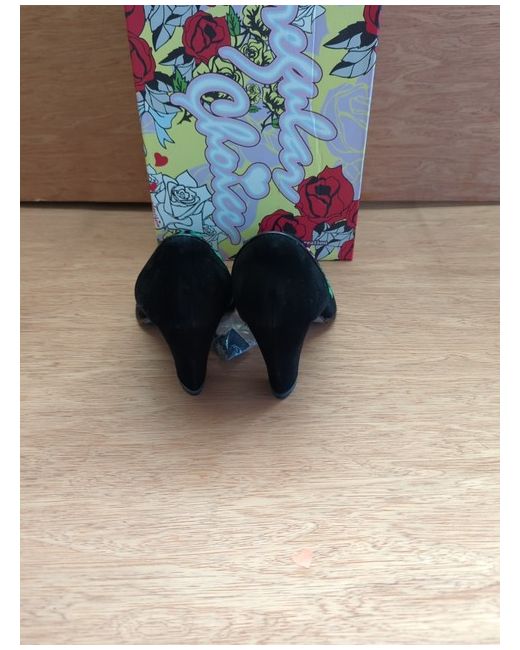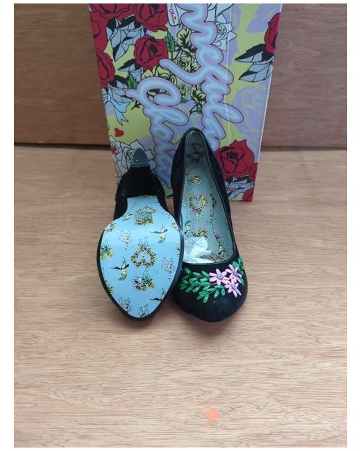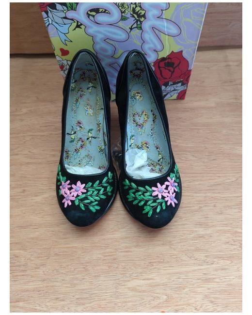 Floral embroidered black velvet irregular choice heels with pattern soles. With box and replacement heel soles