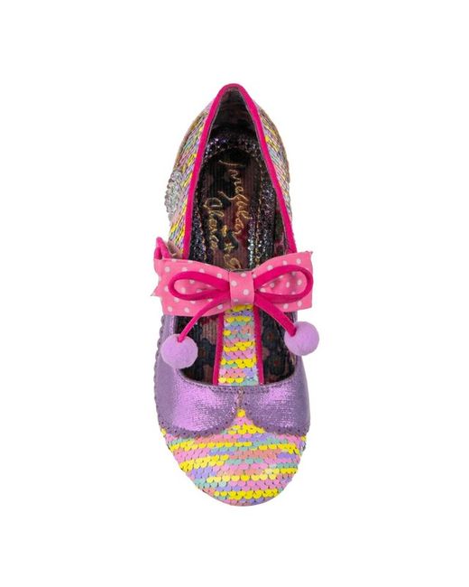 Irregular Choice Charming Chum Shoes. Reversible candy coloured sequins. Hot pink polka dot bow. Colour: Pink. Lilac pom-poms. Self fastening.