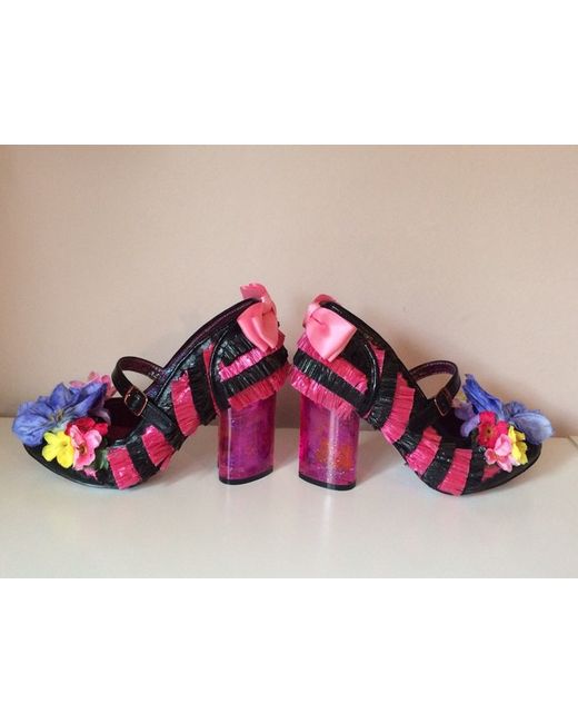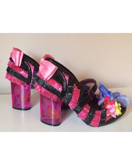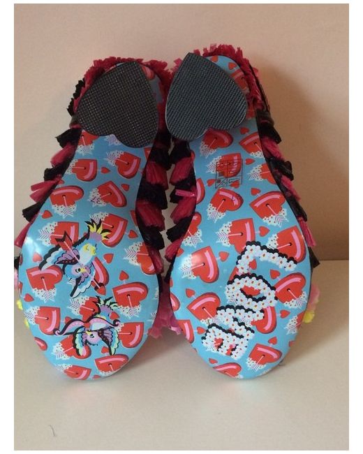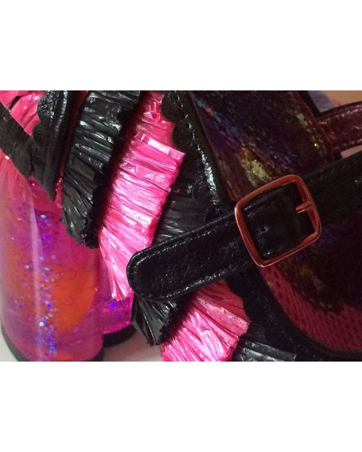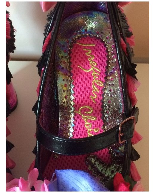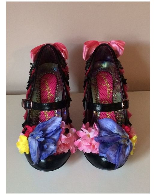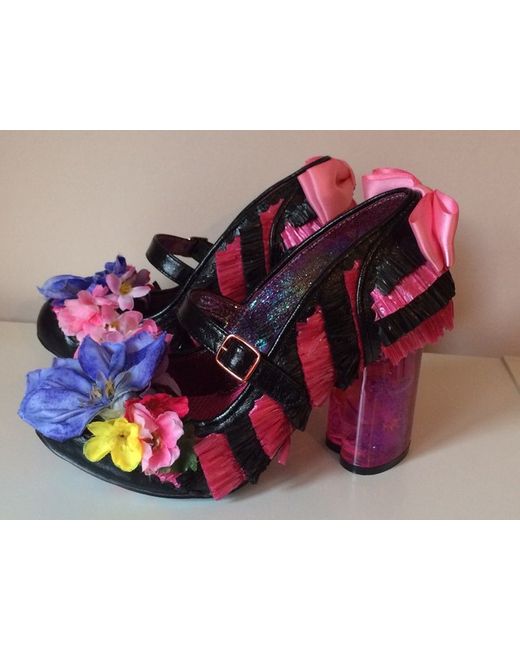 Irregular Choice Amore Pink and Black Faux Raffia Style High Heels Shoes. Fabulous shoes with satin bows, flowers and heart shaped translucent glittery heels. Size 4 (37).