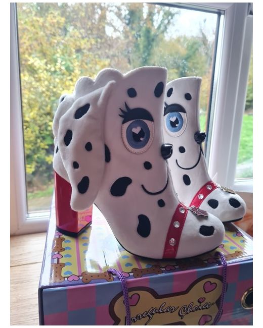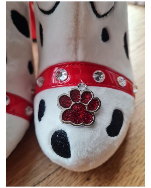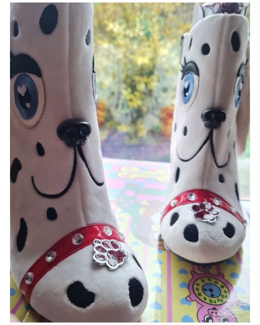 Adorable fun boots with 3d ears nose and tail, diamanté collar and paten red heel - absolutely showstopper! Great if you're a fan of 101 Dalmatians!!
