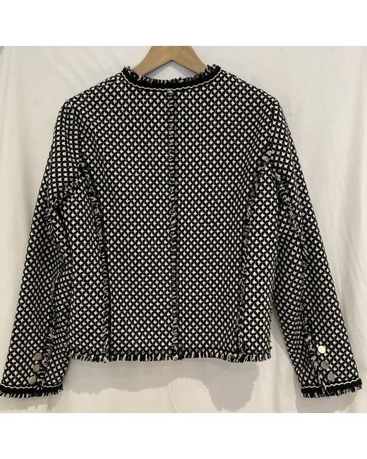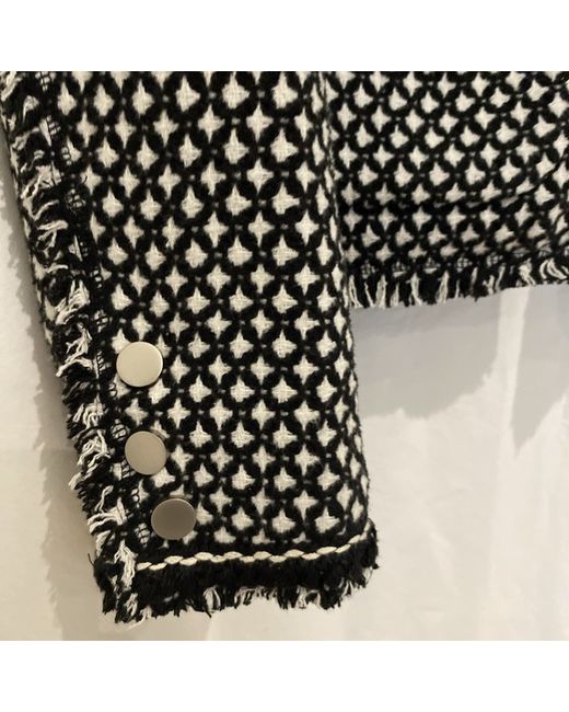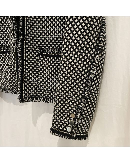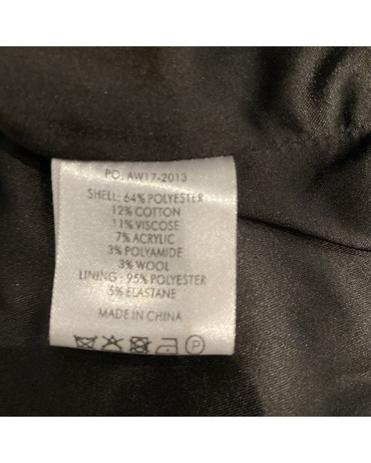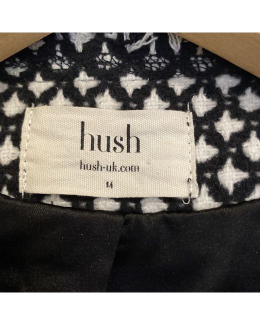 Hush size 14 jacket black/white design. Edge to edge with front pockets. Fringing on jacket is short. Has silver buttons to the sleeves. Good weight to it so warmer smart jacket. Wool like fabric which is a polyester cotton viscose polymaide & wool mix. I've never worn it so no defects.