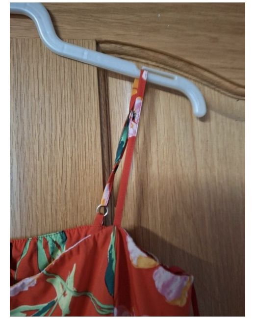 an lovely orange dress with spaghetti straps. it has a floral design throughout the dress. the dress is size 14 and is very light in material