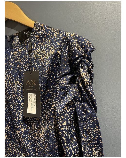 Women's Dark Blue Navy Printed Puff Sleeve Ruched Split Mid Dress 6 Bnwt