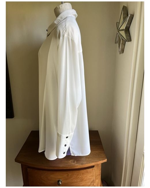 Beautifully made Crepe cream top . By Autograph . Box pleat detail. With the weight of the fabric this blouse hangs really well and has swing . Non crease . Black trim detail in the neckline . Two black button showing with me rest concealed . Long cuffs with 3 black button fastening . Side splits . Washable . 109% polyester UK size 18 European size 46 Measurements are: underarm to underarm 23” across . Length from nape to hem 29” Never worn . New without tags