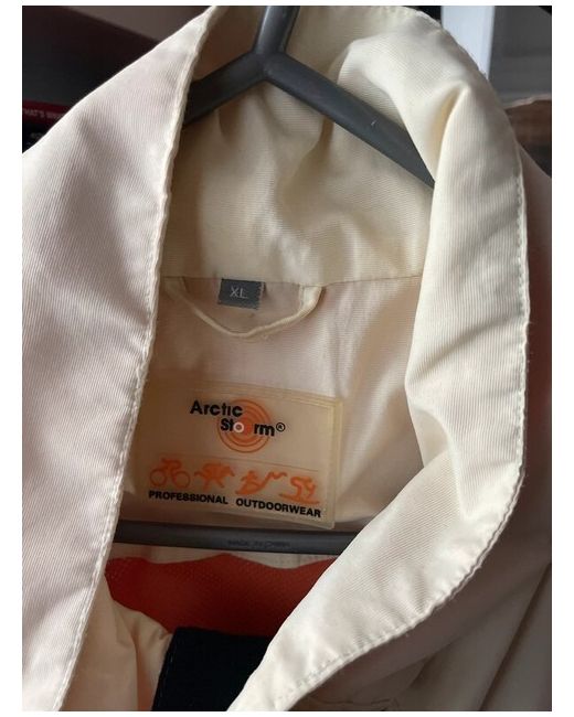 Lightweight cream jacket with orange hood, perfect for layering. In great condition. Features inside pockets and adjustable cuffs. Perfect for a retro-inspired outdoor look.