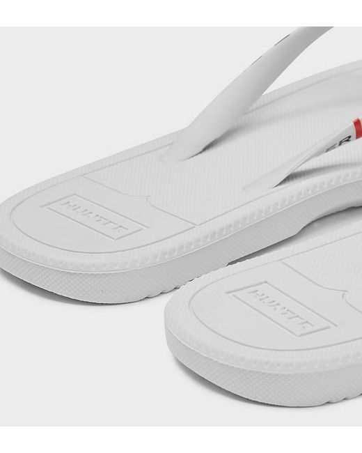 These are Hunter Ladies Original Exploded Logo Flip Flops in white, UK size 5. They feature slip-on style, flat heel, lightweight design, and synthetic outsole. The sandals are designed for casual wear in autumn, summer, and spring. The upper material is rubber with EVA lining and insole, showcasing the Hunter logo. Made in China, these flip flops are part of the Original Exploded Logo Flip Flops product line.