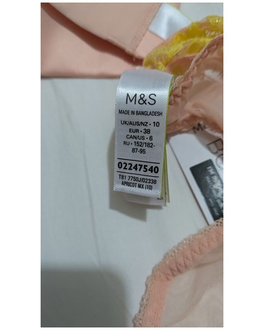 Marks and Spencer Bra set Bra size is 34 DD Bra is padded Knickers Size 10 UK Colour apricot and yellow Fabric is like a satin finish This set is brand new with tags Any questions just ask