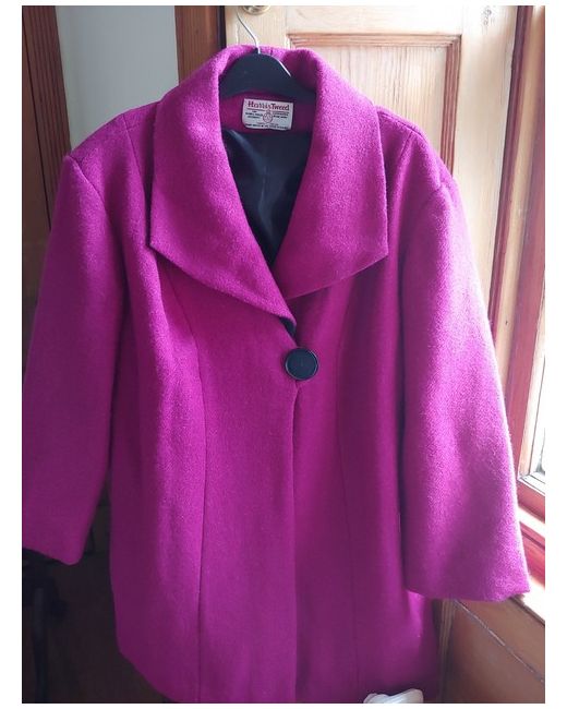 Harris Tweed stylish cerise pink wool coat with single black front button and large collar. A "one off" bespoke made and never worn. Black lining.