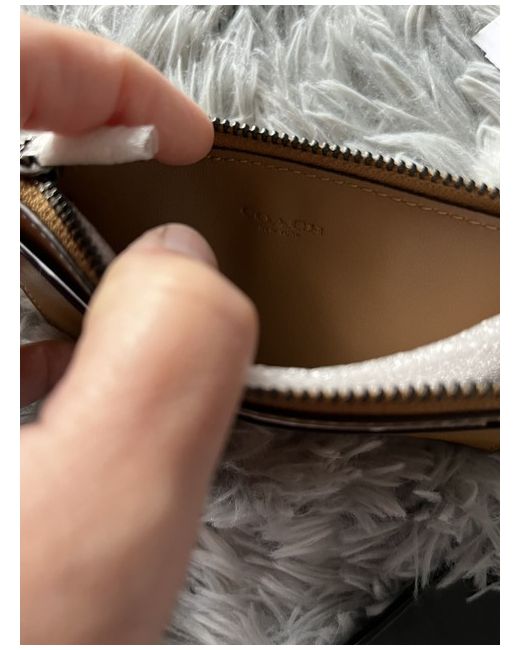 This Coach Zip Card Wallet in Tan/Mustard is a unisex accessory with a zip closure, perfect for storing cards.