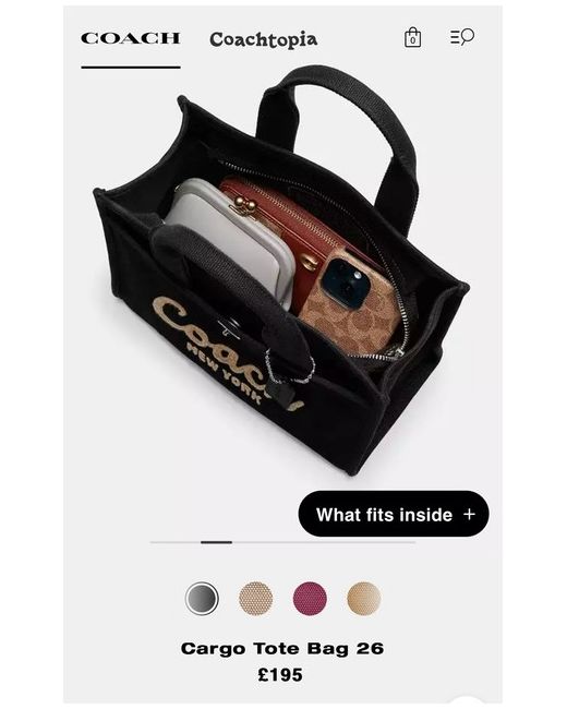 Carry as much (or as little) as you like with our lightweight Cargo tote. Detailed with our cursive Coach script embroidery and iconic turnlock closure, this compact 26 has an open interior with room for an iPad, two outside pockets for easy organization and a removable webbing strap for shoulder or crossbody wear.