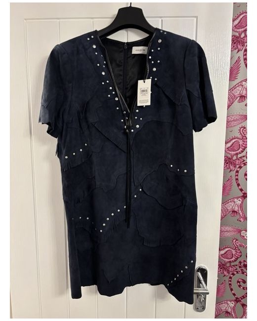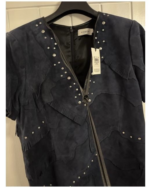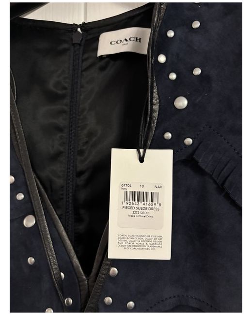 This is a new COACH studded patchwork suede short dress in blue. It features a V-neck, short sleeves, and a mini length. The dress is a size 14 and made of suede fabric. The design includes studded accents, giving it a stylish and unique appearance suitable for women's wear.