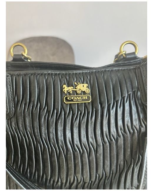Crafted from luxurious leather in a classic black hue, this Coach Madison shoulder bag effortlessly combines elegance with practicality. The bag features a striking purple interior lining that adds a splash of colour to the sophisticated exterior.
