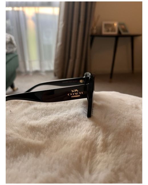 These Coach women's sunglasses are new with 1 small defect. There is one small scuff on one of the frames but it’s unnoticeable They feature oversized square frames in black, with black lenses.