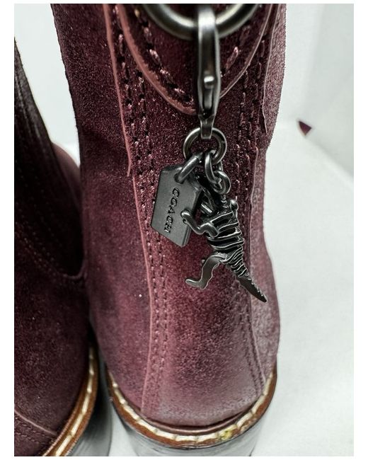 Gorgeous burgundy metallic style fabric with cute dinosaur charm on the back. These are slim fitting boots. Not ideal for wider feet.!