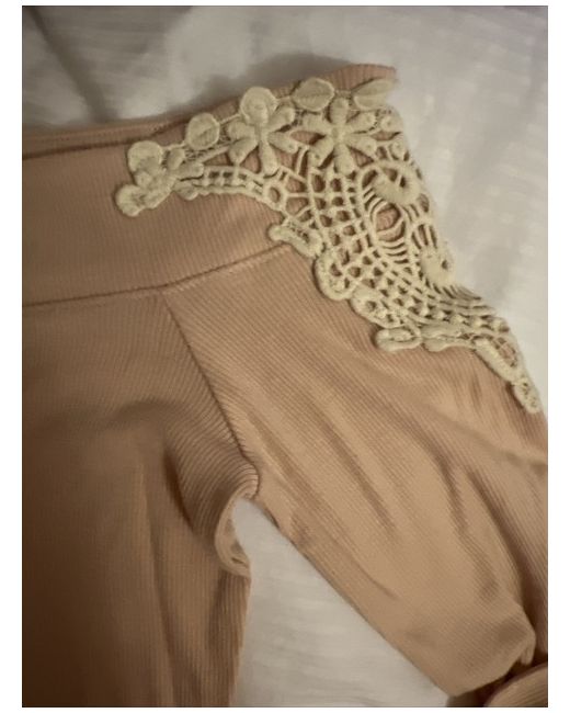 Off the shoulder thin jumper with Lace type design sewn on the shoulders. It’s a slim/tight fit