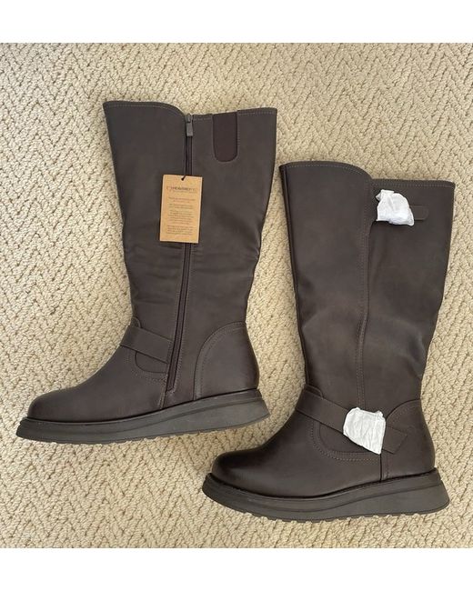 A great looking Vegan friendly knee high wedge boot from Heavenly Feet . Size UK 5 EEE EU 38 Colour- Chocolate Brown faux leather with faux fur lining, New with tags, The boot features Removable Memory foam insoles. Twin buckle detail Soft textile lining. Full side zip Lightweight feel Rugged durable outsole. Approx measurements Heel height 3.5cm Boot height 34cm Free UK P&P