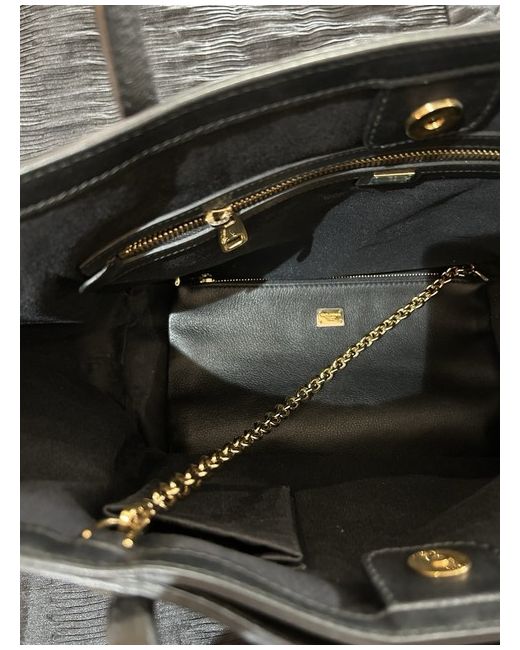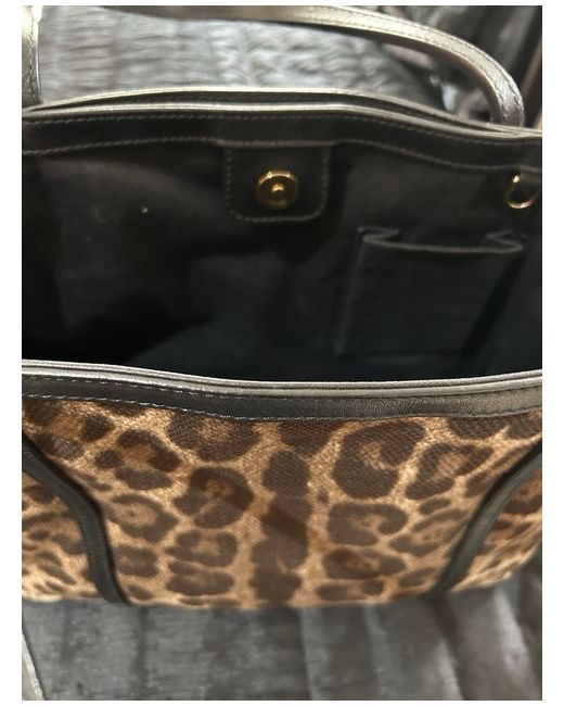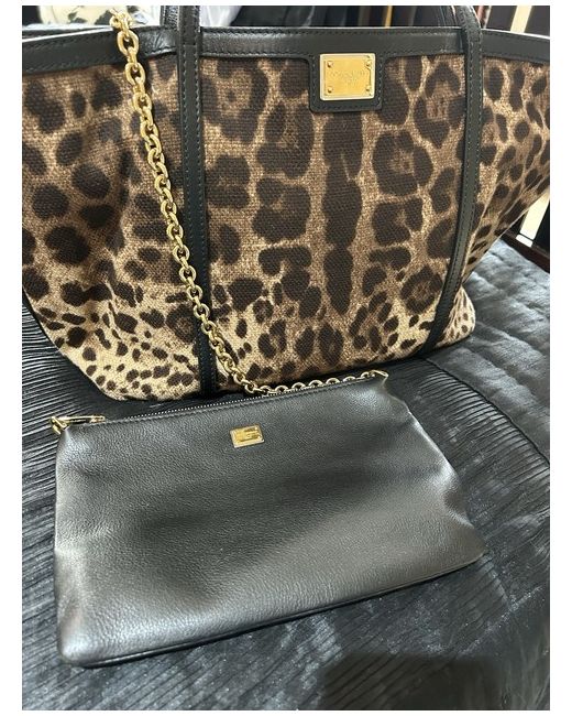 Animal print canvas bag with black leather handles and interior. Magnetic closure. Detachable clutch bag with gold strap.