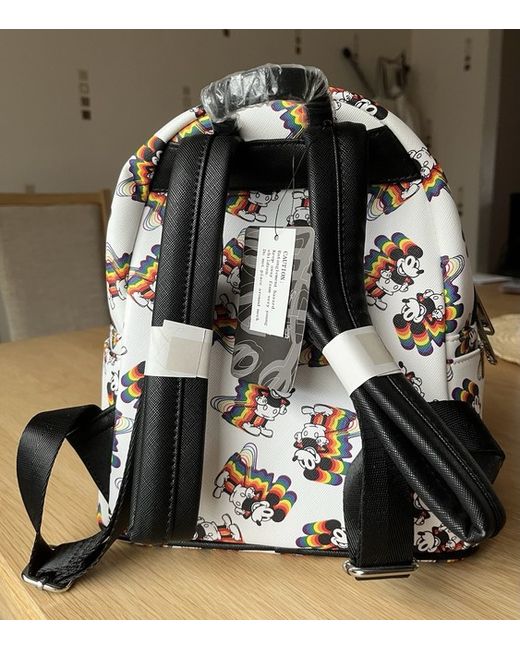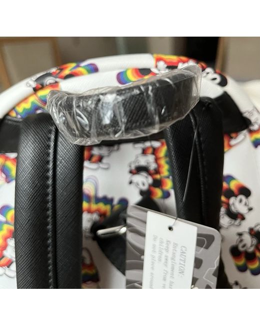 The Disney Mickey Mouse Loungefly Mini Backpack in Disney Pride is a stylish and compact accessory for women. Featuring a striking white exterior with rainbow accents, this backpack is designed with a zip closure, black handles, and silver hardware. The iconic Mickey Mouse character adds a touch of charm, making it a must-have for fans of Disney and LGBTQ+ pride. With its faux leather material and mini size, this Loungefly backpack combines functionality with a fun and colourful aesthetic.