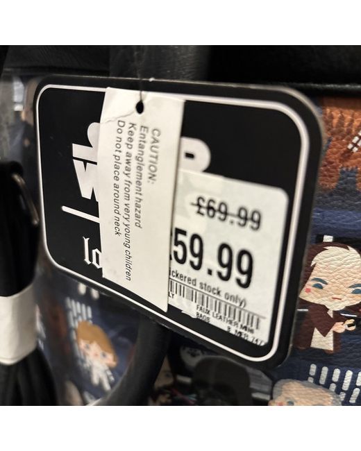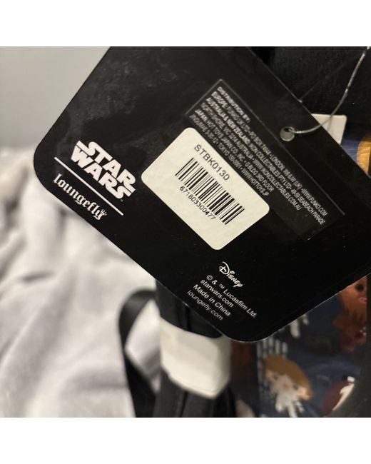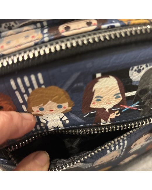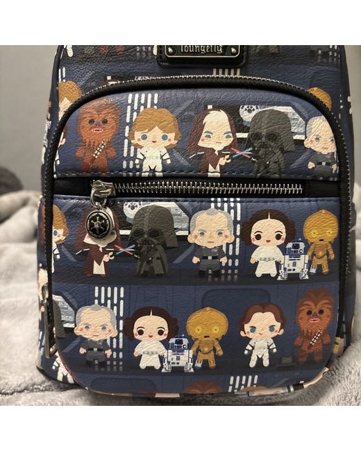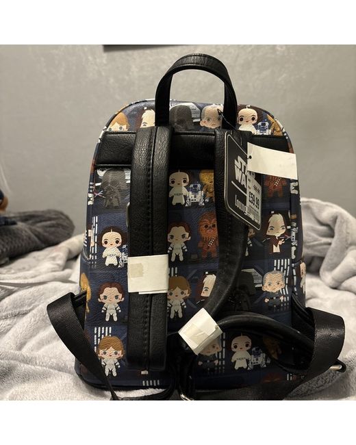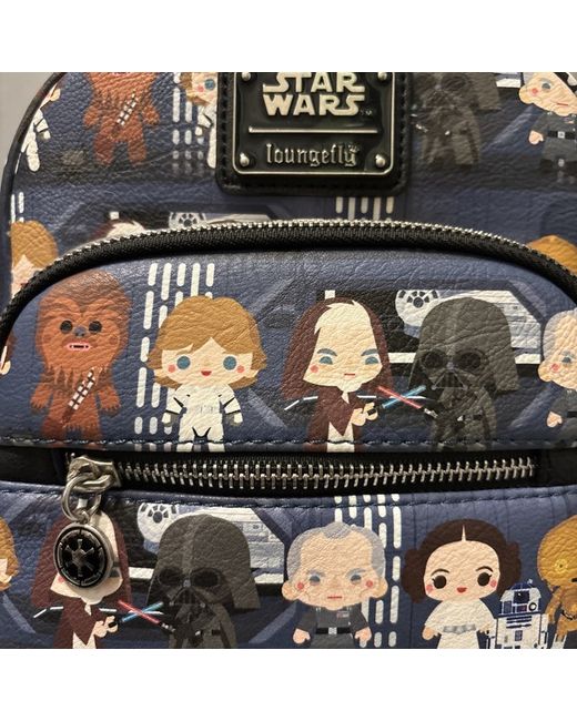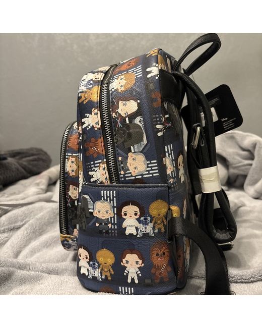 This Loungefly Star Wars backpack for women features a multicoloured exterior with a black lining. The backpack has a black handle/strap and is made of polyurethane material.