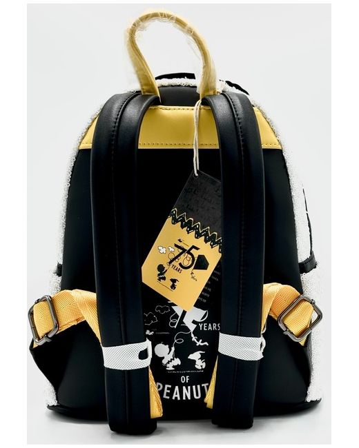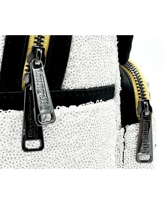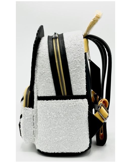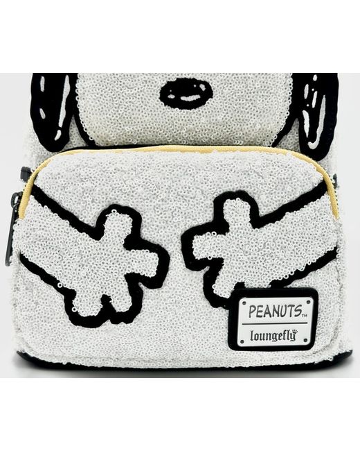 This beautifully glittering bag features all over white glistening sparkles on the front alongside a head and ears appliqué with embroidered facial details. Cloisonne Loungefly x Peanuts Label. 75th Anniversary Artwork.