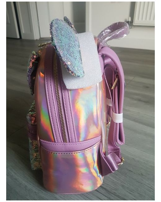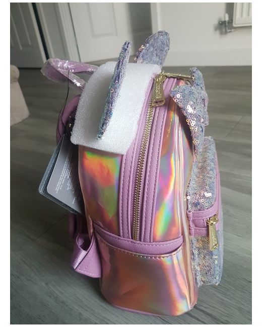 This is a brand new Disney Loungefly mini backpack. It is from the Earidescent collection for the Walt Disney World 50th annimversary. It is holographic pink. It has Minnie Mouse ears, with a sequin bow and sequin front pocket. It is brand new with the tag. From a pet and smoke free home.