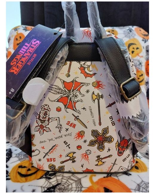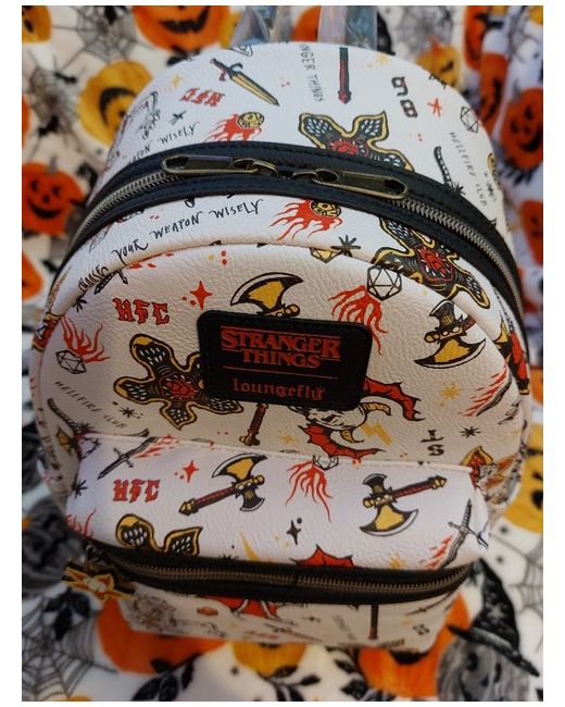 The exterior is made of faux leather in a multicoloured pattern, with white hardware accents that complete the look.