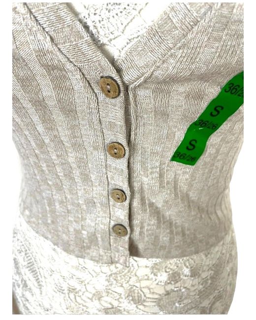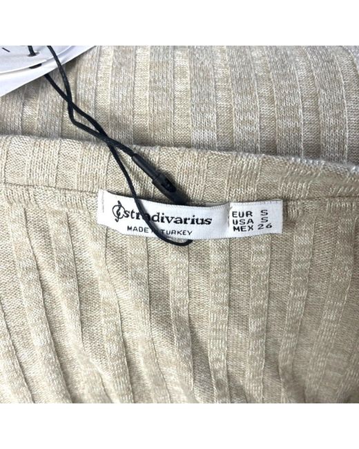 This stylish Stradivarius cream ribbed crop-top is a must-have in your wardrobe. The button closure and sleeveless design give it a chic look that can be paired with any bottom wear. The beige color and ribbed accents add a touch of elegance to the croptop.