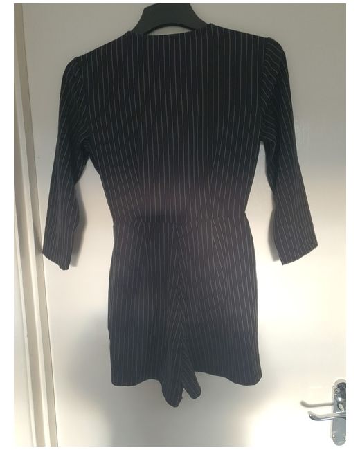 Wrap front playsuit with tie waist. Black Pinstripe.